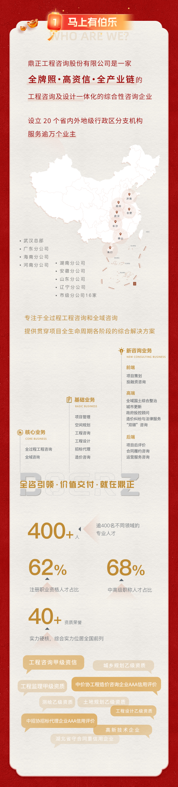 鼎正工程咨询有限公司成立于2006年5月,公司具有工程咨询、项目管理、工程造价咨询、工程招标代理、土地规划设计等多项专业咨询资质...
